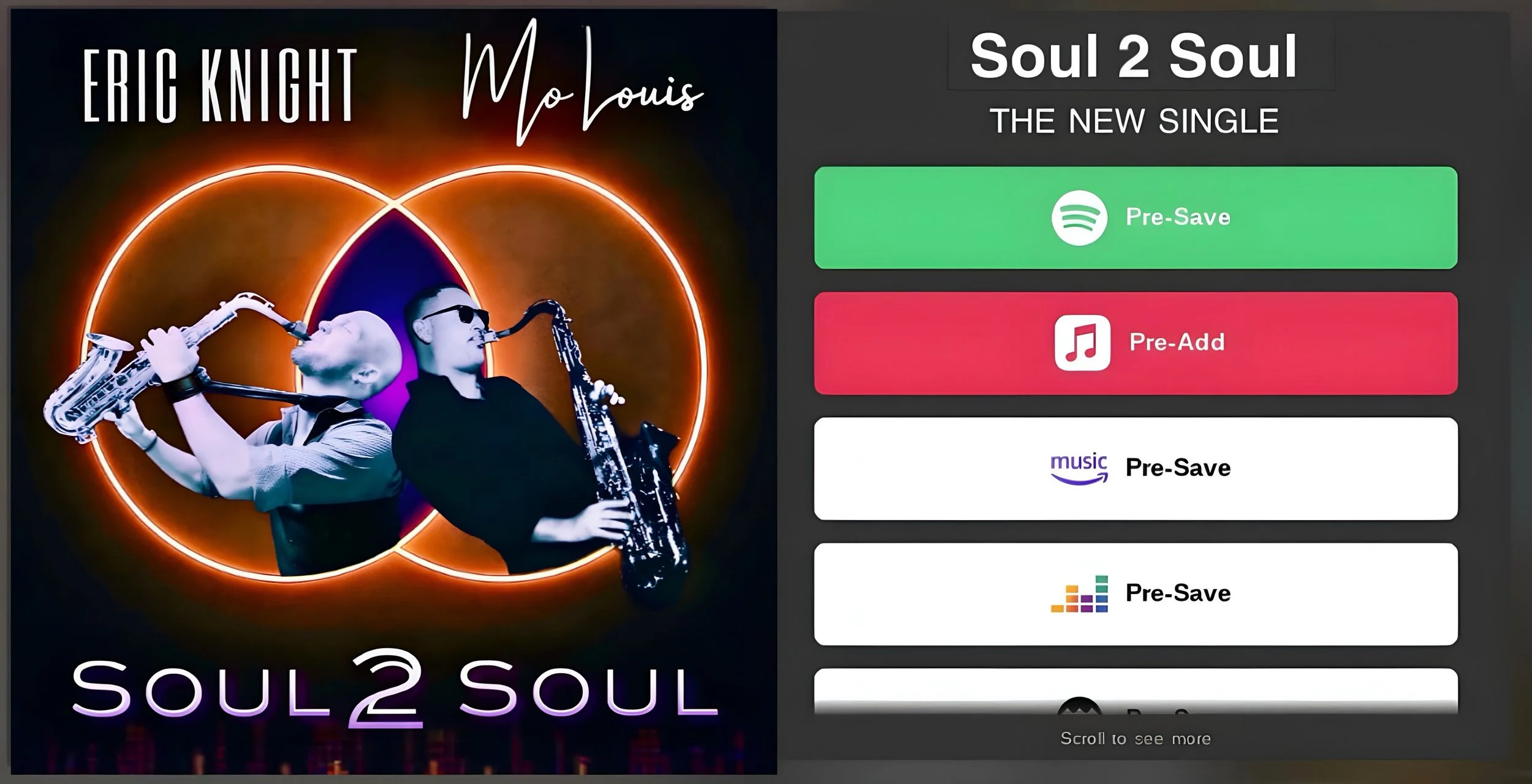 Smooth Jazz favorites Eric Knight and Mo Louis come together on their new single, “Soul 2 Soul,” delivering a seamless fusion of R&B, soul, and smooth jazz—an irresistible groove that feels like a warm summer breeze on a beautiful coastal drive. As the sun kisses your face and the groove lifts your spirits, indulge in the silky smooth sax melodies and infectious vibes that will keep you smiling for days. Destined for top playlists worldwide, come experience why “Soul 2 Soul” will be a 2025 summer hit, leaving lasting impressions for years to come.